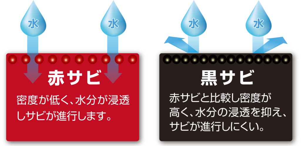 サビ転換剤は、赤サビの表面を黒サビ(黒色防錆皮膜)に変化させ、水分の透過度を下げることで、サビの進行を抑制します。